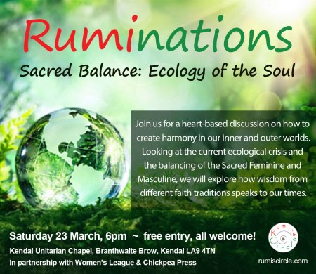 Join Rumi’s Circle for a heart-based discussion on how to create harmony in our inner and outer worlds. Looking at the current ecological crisis and the balancing of the Sacred Feminine and Masculine, we will explore how wisdom from different faith traditions speaks to our times.