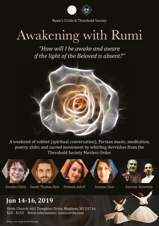 Join us for our first Rumi’s Circle event in the USA, a weekend exploring how we can awaken to Reality. With sohbet (spiritual conversation), Persian music, meditation, poetry, zhikr, and sacred movement by whirling dervishes from the Threshold Society Mevlevi Order.